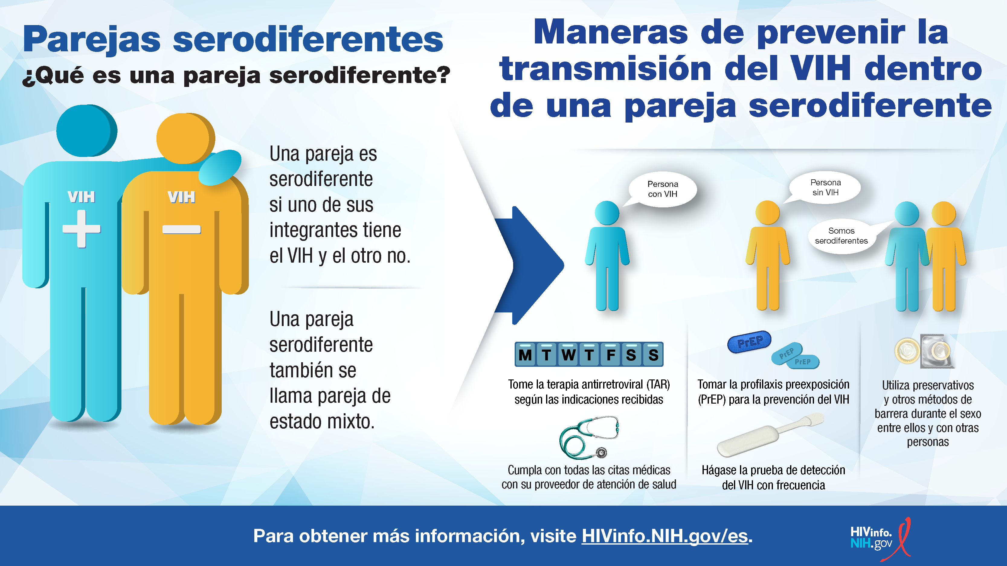 ¿Eres parte de una pareja donde una pareja tiene VIH y el otro no? Conozca las medidas que ambos pueden tomar para prevenir la transmisión del VIH en parejas serodiferentes.
