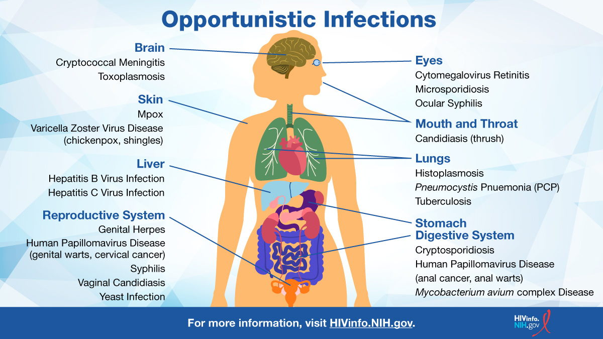 Once a person has HIV, the virus begins to multiply and damage the immune system. A weakened immune system makes it harder for the body to fight off OIs, which take advantage of a person’s weakened immune defenses.